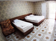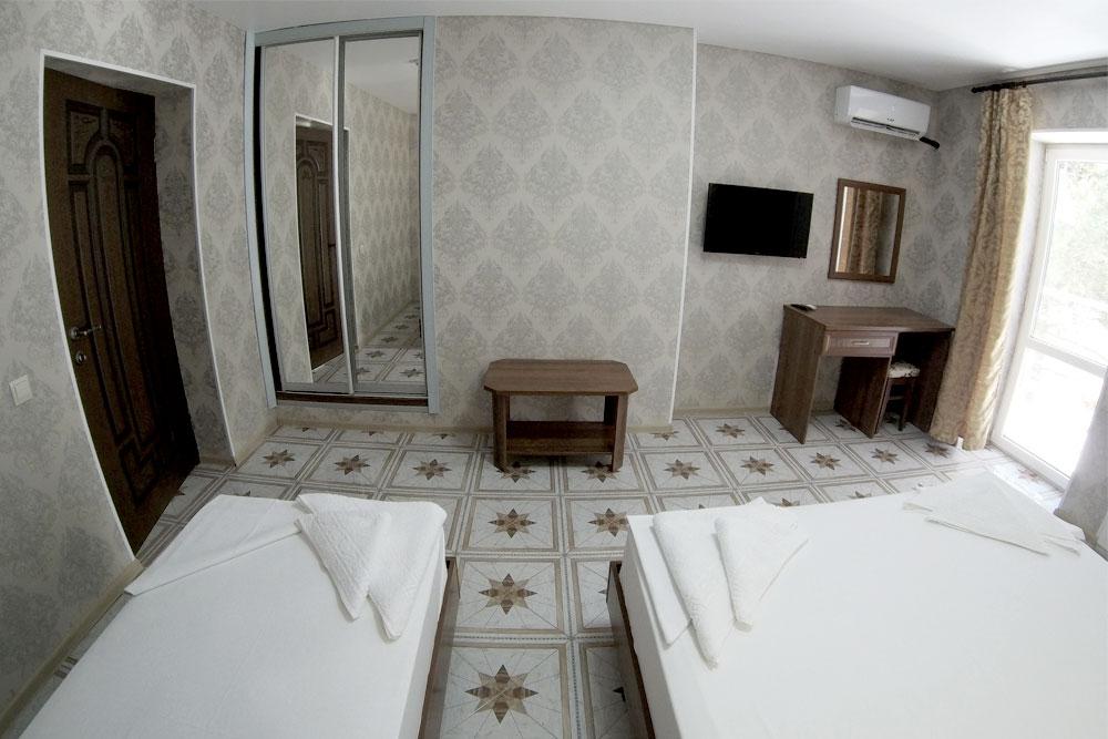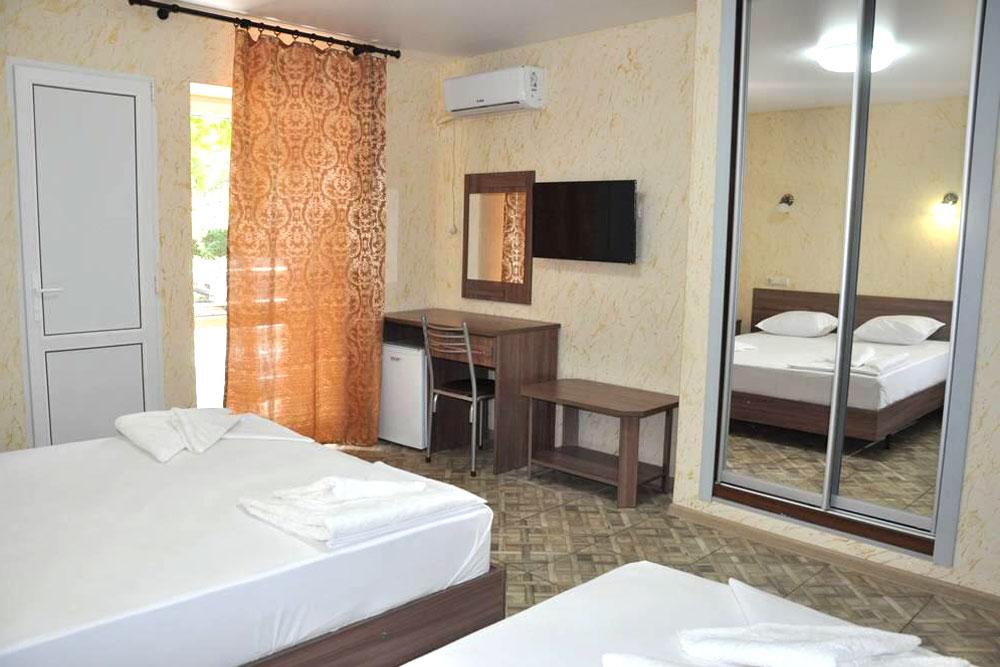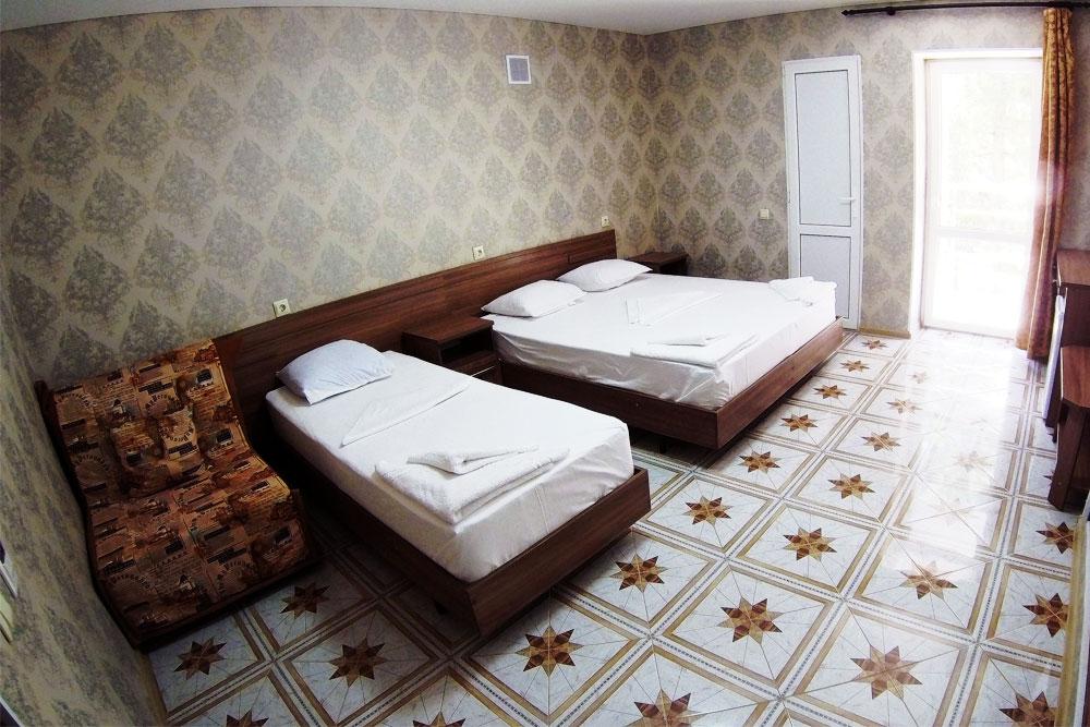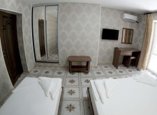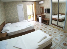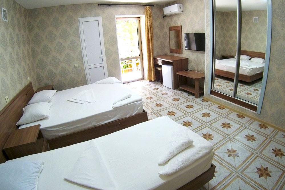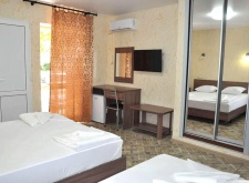 Комфортабельный номер с удобствами. Удобен для размещения семьи из трех человек. Оснащен большой двуспальной кроватью, односпальной кроватью и раскладным креслом. В номере имеется все необходимое для комфортного проживания: современная мебель, кондиционер, холодильник, жк-телевизор, санузел с душевой кабиной, мойдодыром, туалетом.