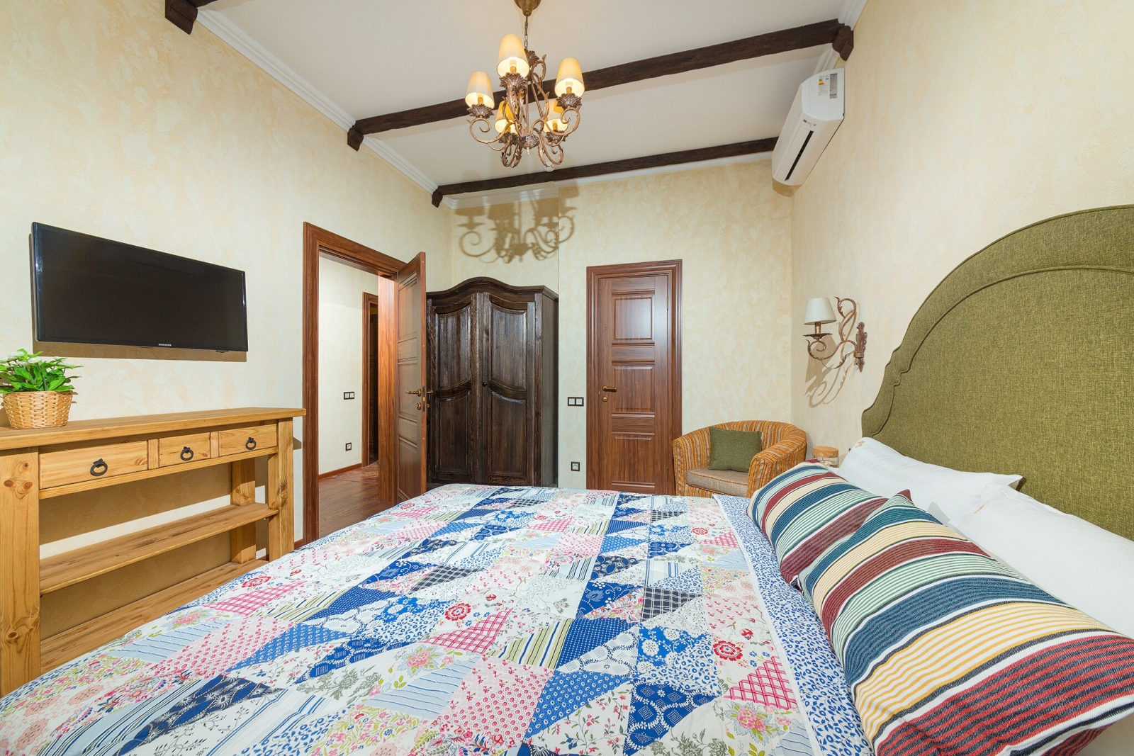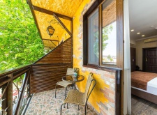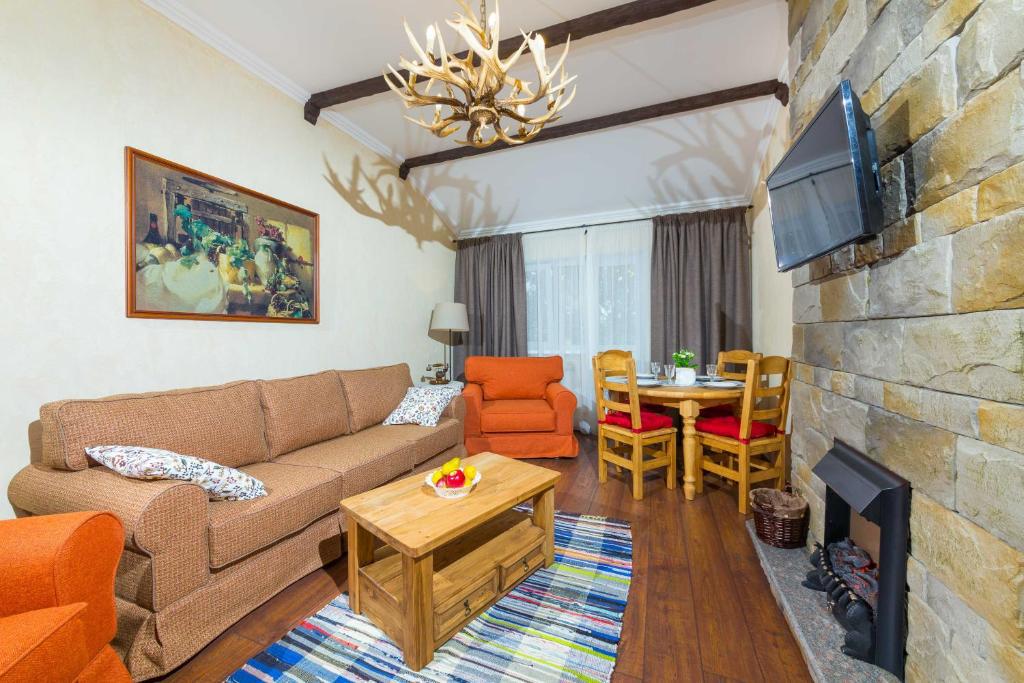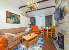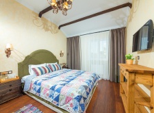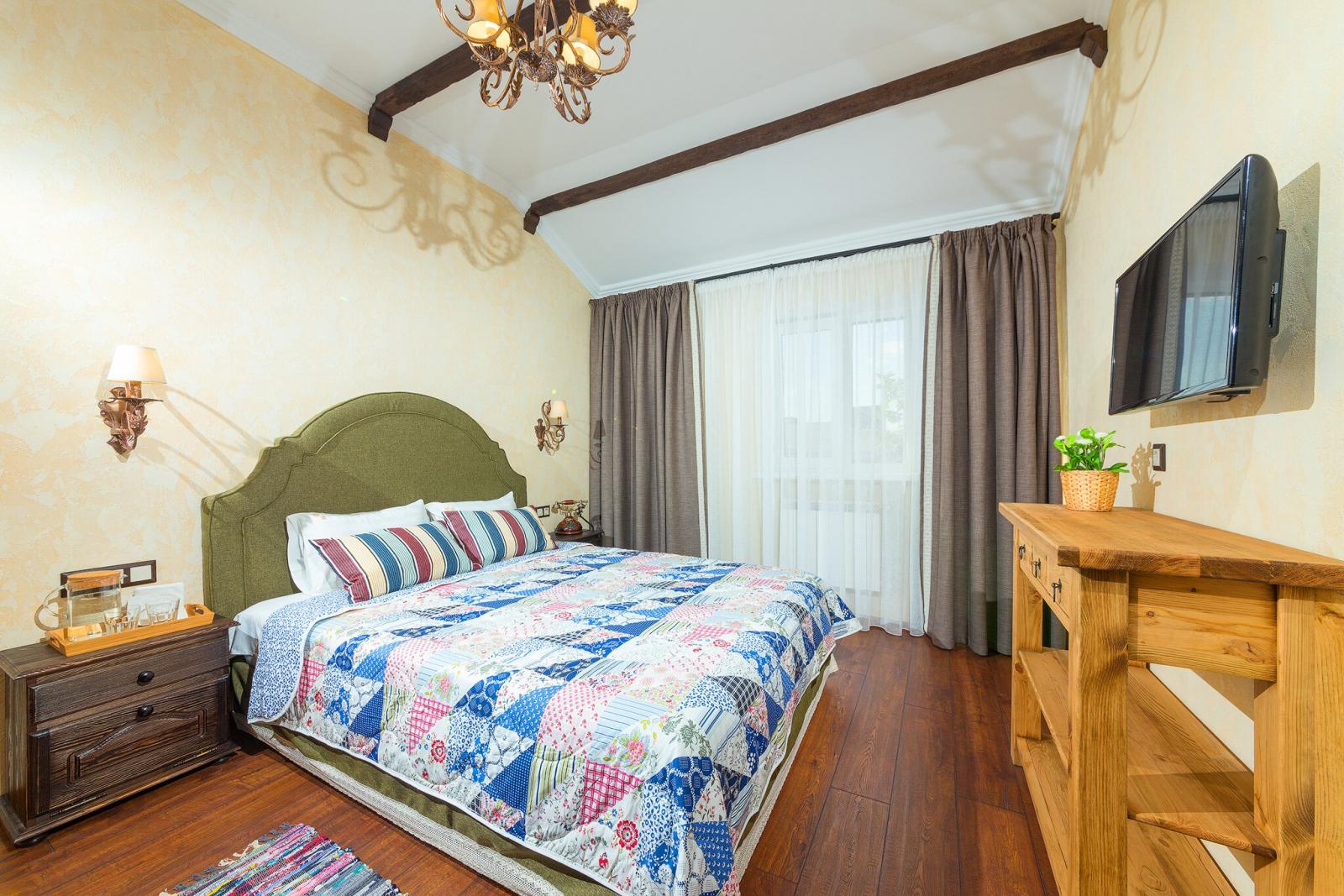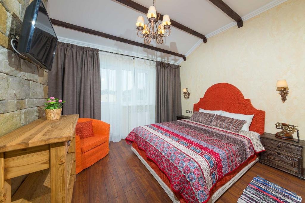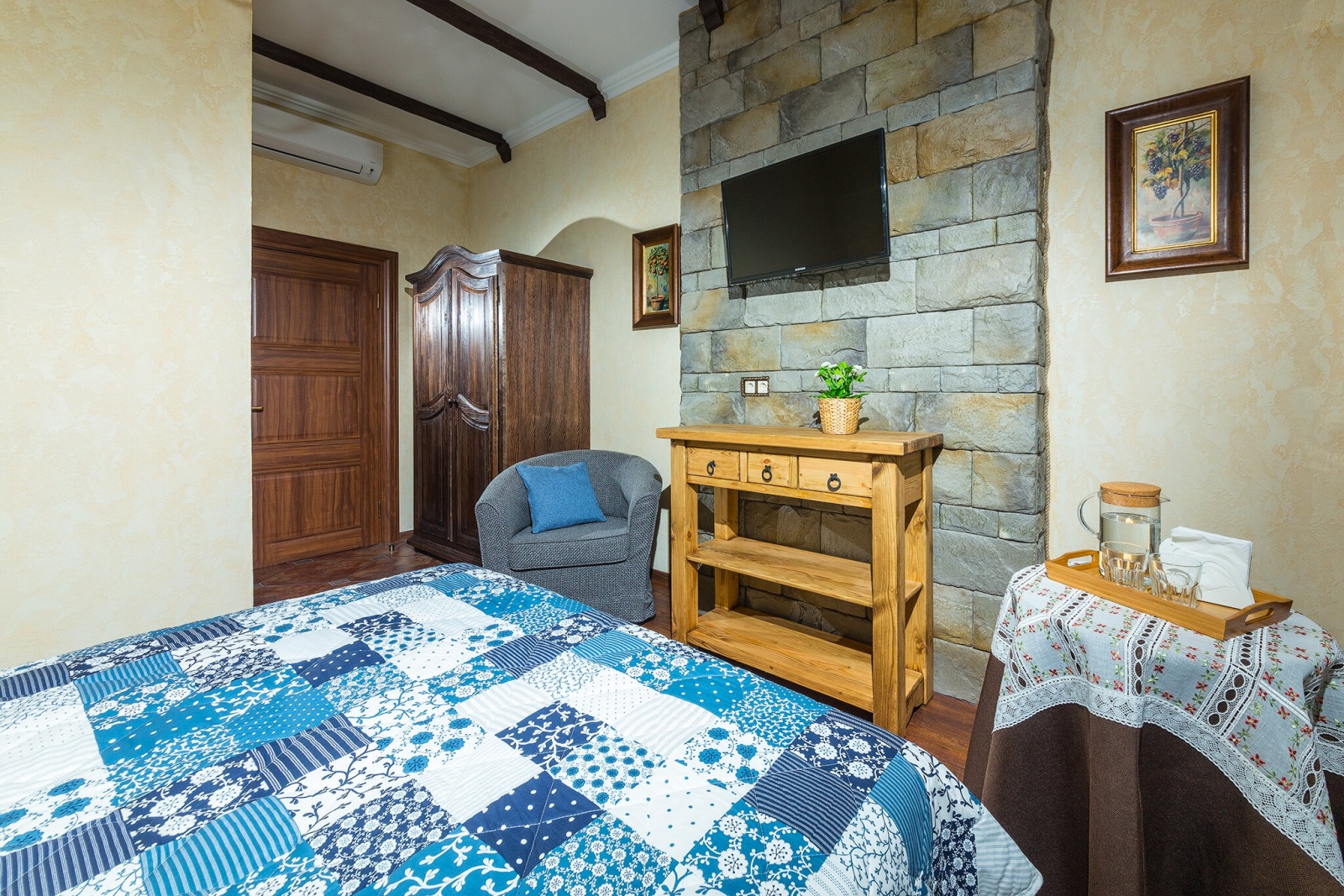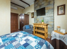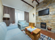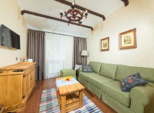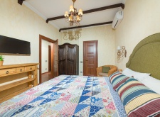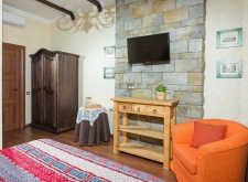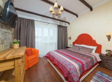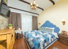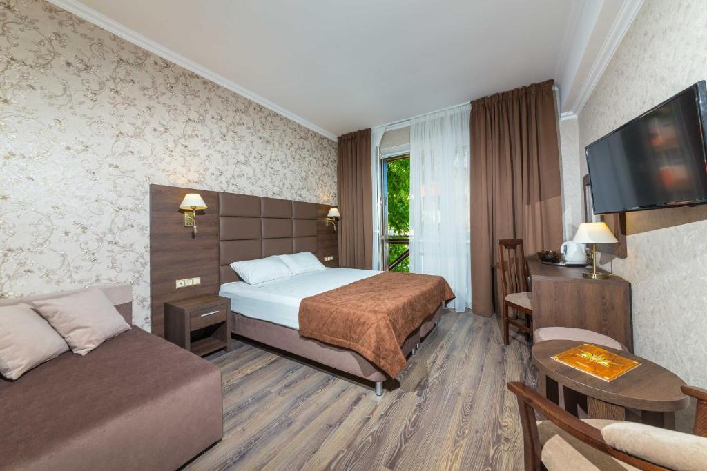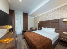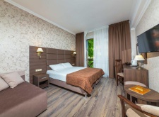 В номере: широкая кровать или две раздельные, вещевой шкаф, рабочее место, трюмо, пуфик, зеркало, тумбочки и светильники. Из бытового оснащения имеется электрочайник, система кондиционирования, плазменный ТВ, телефон. Ванная комната с необходимым набором сантехники. Балкон не во всех номерах.